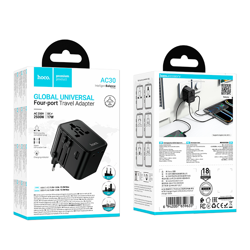 Adaptador Viajero Universal Hoco AC30 4 Puertos 17w Negro