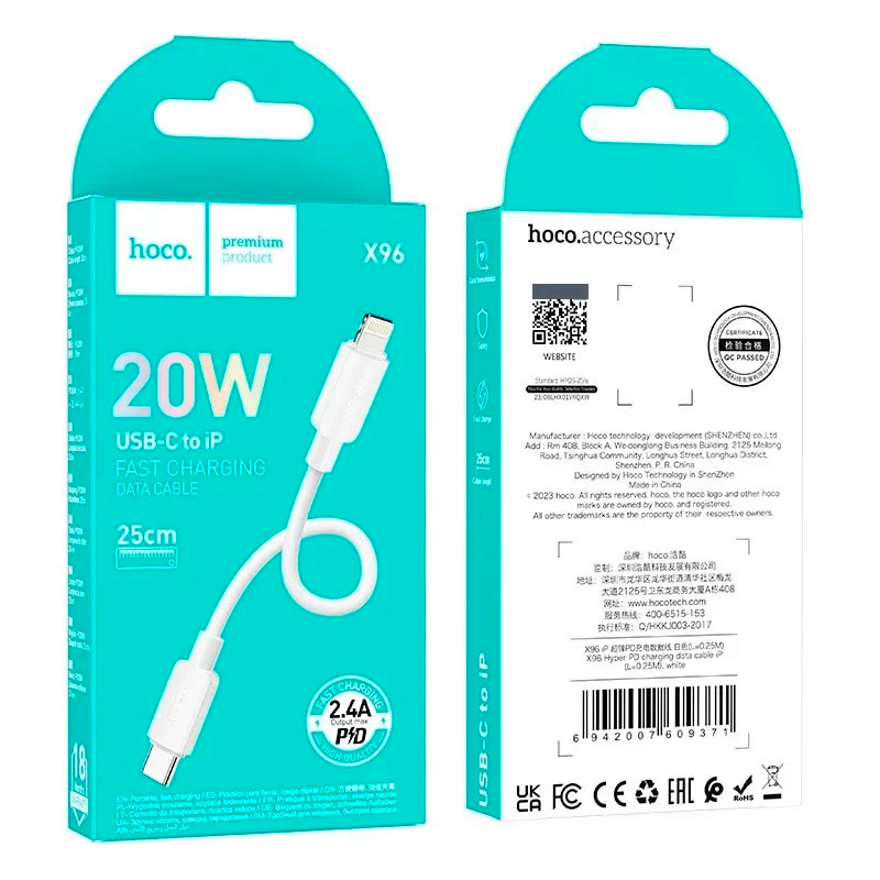 Cable Tipo C a Lightning 20w Hoco X96 25cm Blanco