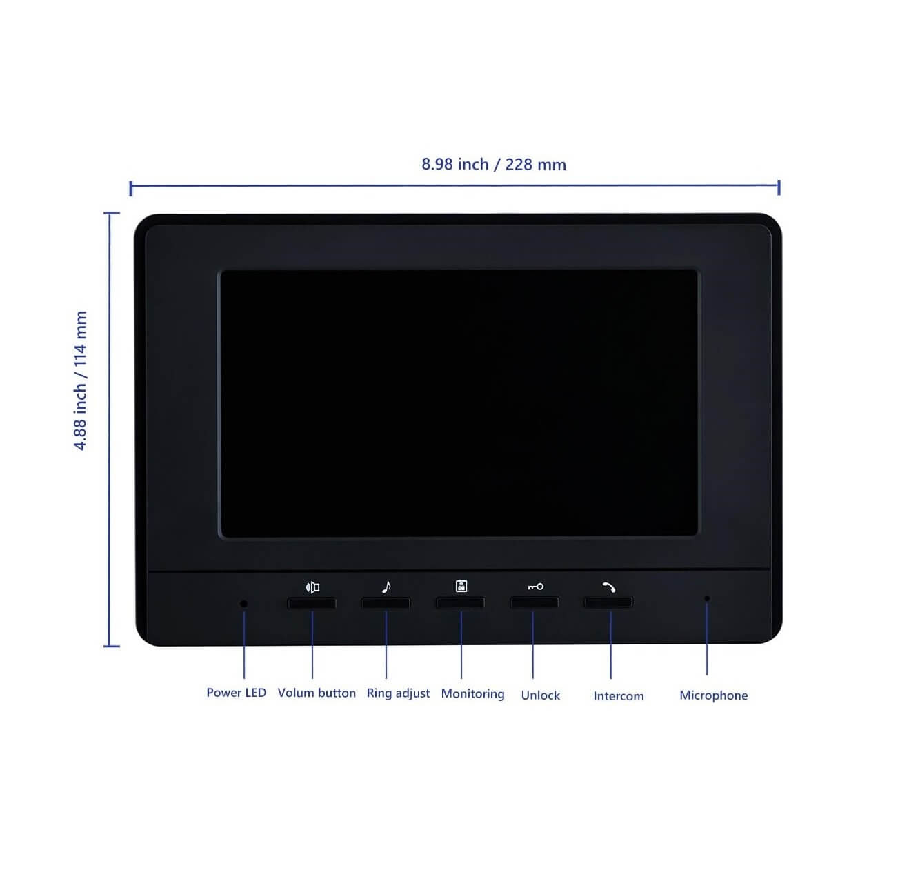 • 7 características principales: pantalla LCD de 7 pulgadas; 16 tipos diferentes de campanillas de puerta; volumen, brillo y contraste son ajustables; cámara IR con visión nocturna; función de control de bloqueo eléctrico; intercomunicador manos libres; apagado automático.